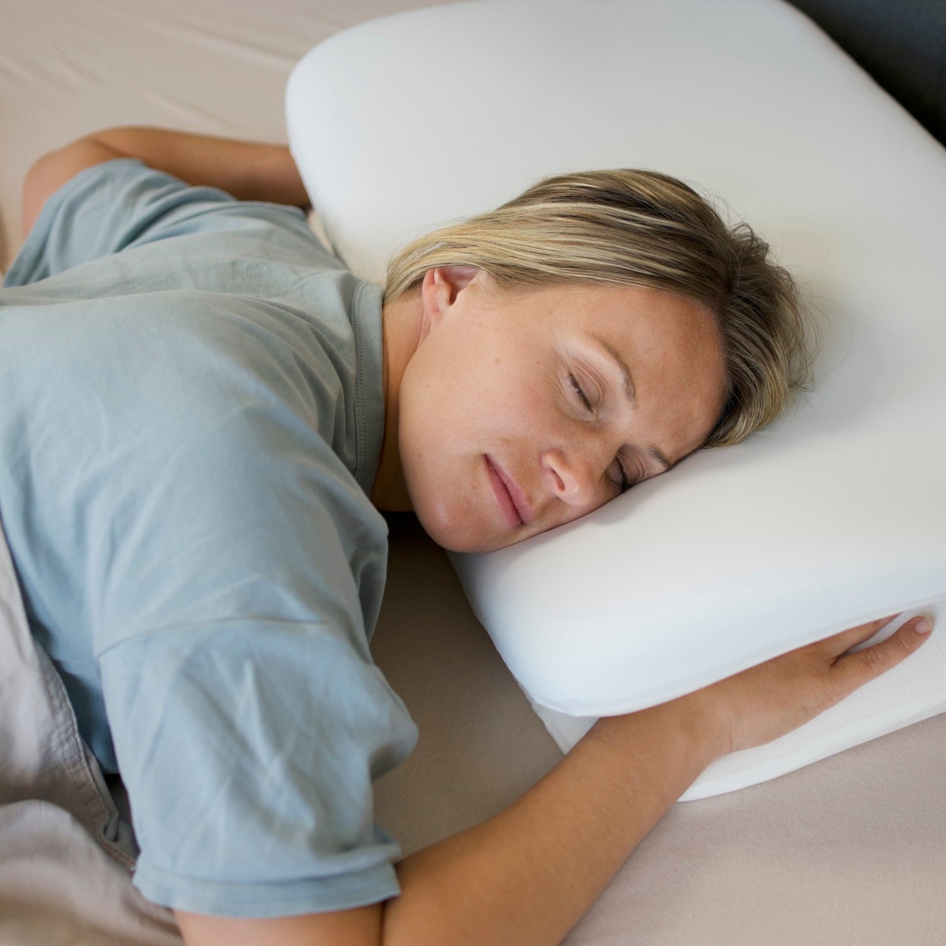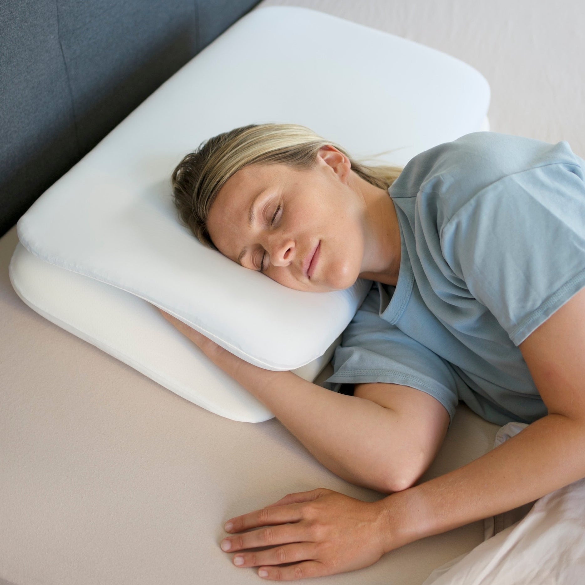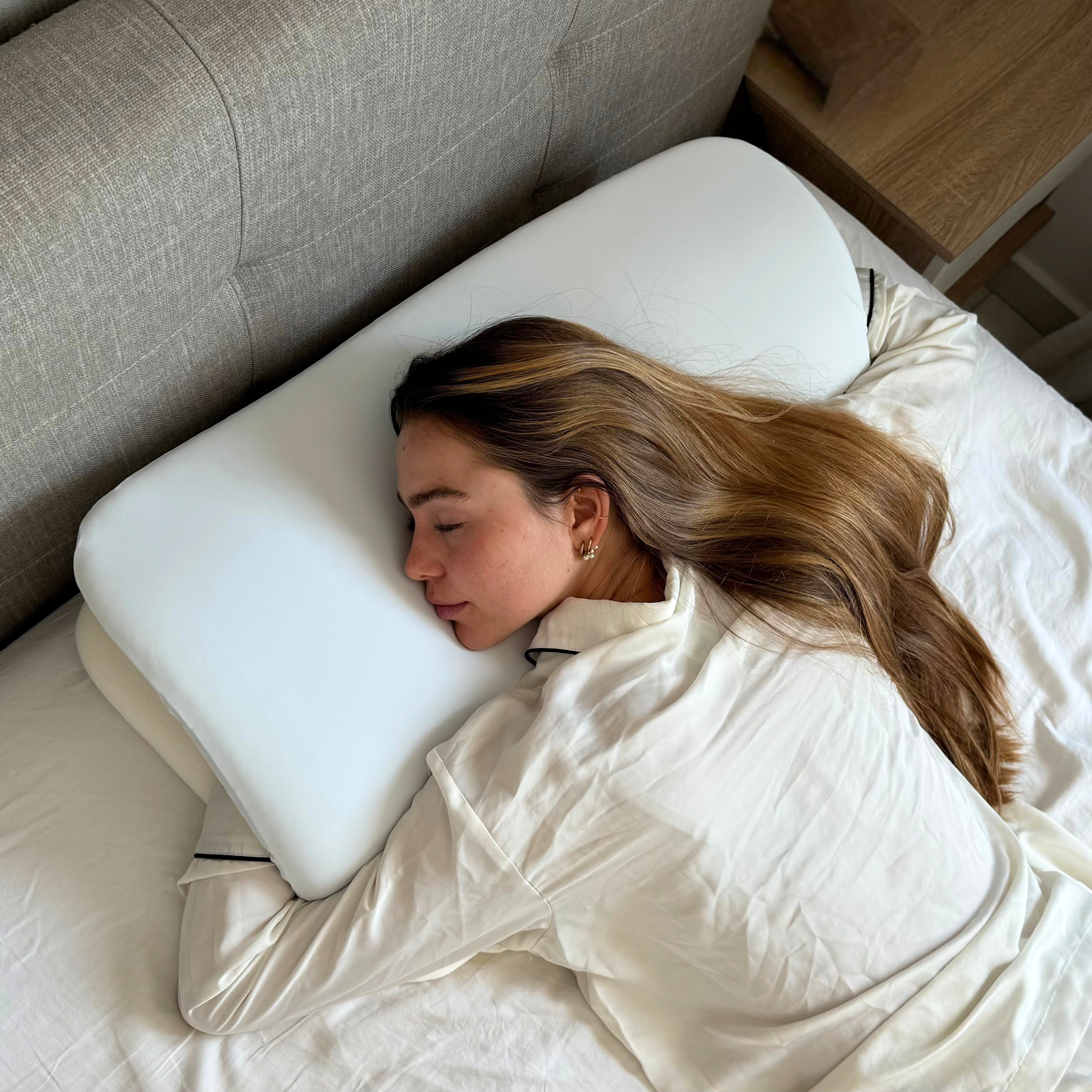 In der Seitenlage sorgt das Kissen dafür, dass Ihr Arm eine ergonomisch günstige Position einnimmt, ohne einzuschlafen oder unangenehm abzuknicken. Gleichzeitig wird Ihre Wirbelsäule stabil unterstützt und bleibt in ihrer natürlichen Haltung – für weniger Druckpunkte, weniger Verspannungen und erholsameren Schlaf.